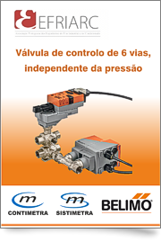 Válvula de controlo de 6 vias, independente da pressão diferencial, própria para o controlo, e transmissão, de caudais de água quente e fria em unidades terminais - tais como ventiloconvectores, tetos frios/quentes, vigas frias/quentes, outras - com uma só bateria - sistema a dois tubos.